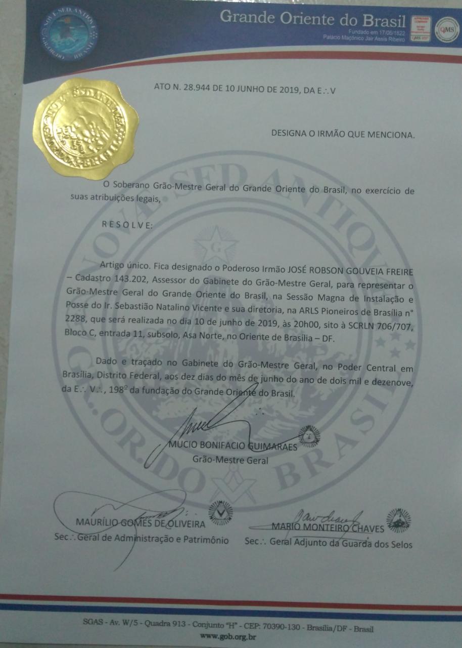 No dia 09/06/2019 foi realizada a Sessão de Instalação e Posse do Venerável Mestre e da nova Administração.